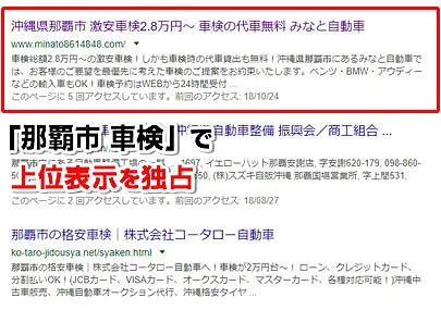 公開2ヵ月で「那覇市 車検」での上位表示を獲得