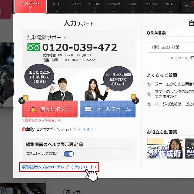 編集ページ上部「ヘルプ・サポート」の下部にある「写真撮影サンプルのPDF資料(ダウンロード)」より閲覧、ダウンロードが可能です。