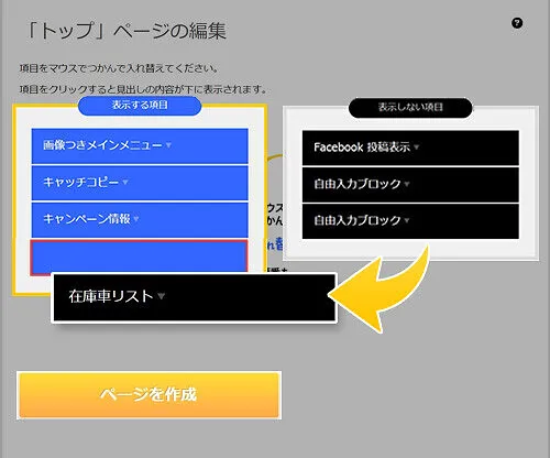 (4)右側の「表示しない項目」の中にある「在庫車リスト」をマウスでドラッグして、左側の「表示する項目」内に移動させます。
